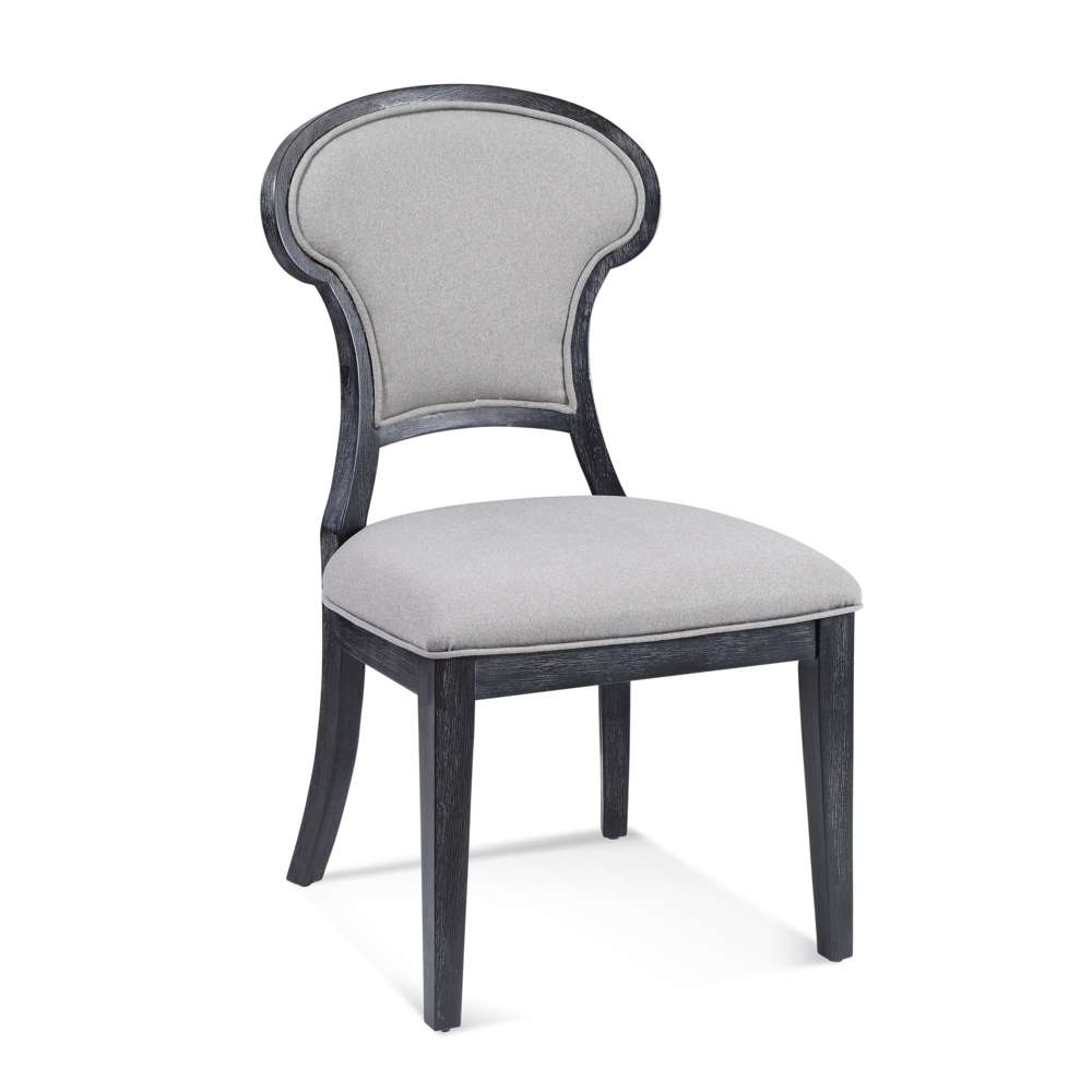 The Mateo Dining Chair features transitional styling. Features a curved seat back with tapered front legs and tapered flared back legs. The wood frame is finished in black oak veneer, complementing the gray rub-through style upholstered fabric on the seat and back. Features also include drive in floor glides on the leg bottom and a high density foam seat cushion. Seat Dimensions: 20.5"W x 18"D x 18"H.
