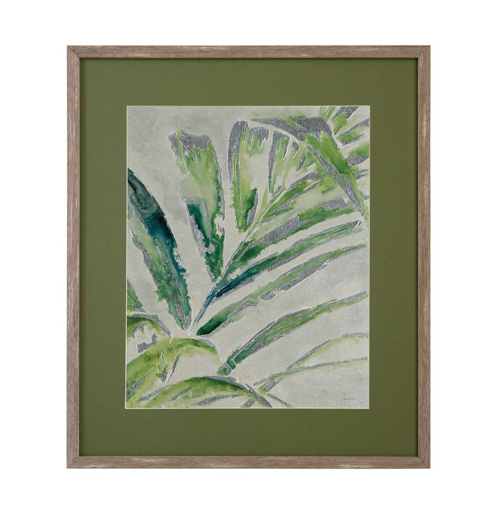 Green Palm I is a limited edition print, signed and numbered by the artist and printed on fine art cotton rag paper. The print is framed in a 1" gray barnwood frame with a celery color matboard.