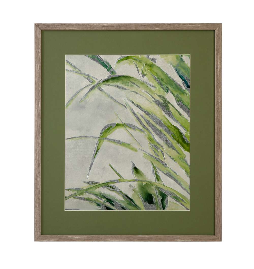 Green Palm II is a limited edition print, signed and numbered by the artist and printed on fine art cotton rag paper. The print is framed in a 1" gray barnwood frame with a celery color matboard.
