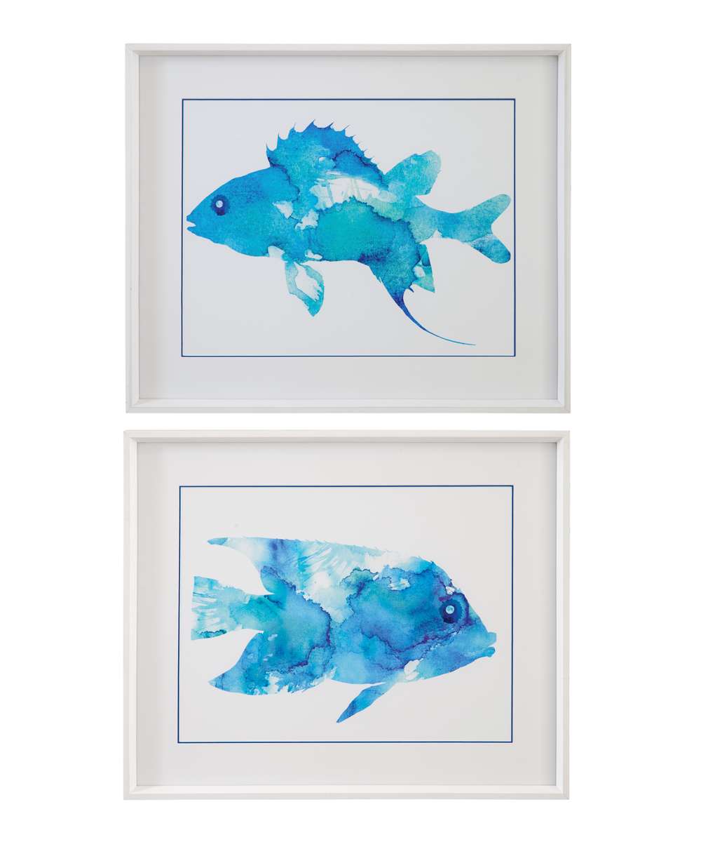 Fish is a two piece set of prints framed in a white 3/4" molding with a blue matboard.