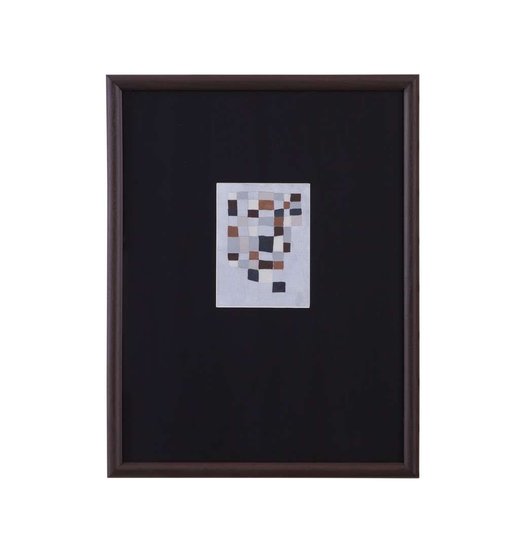 Multi Parcels II is a print framed in a brown woodtone 1" molding with a black matboard.