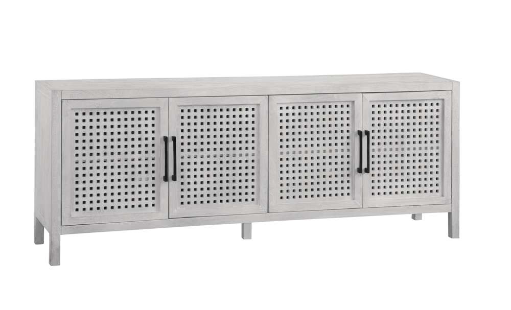 The Pentak White Server brings a blend of modern and coastal vibes to your space. Crafted from white-wash mango wood, it features soft-close door hinges and matte black iron bar door pulls for added convenience and style. With four doors adorned with open pierced fretwork detailing, this server offers ample storage space along with two fixed interior shelves and media cable management. Each piece of mango wood is unique, showcasing natural variations in color, density, grain, and finishing. With its modern coastal design and neutral color palette, the Pentak White Server is sure to complement any space.