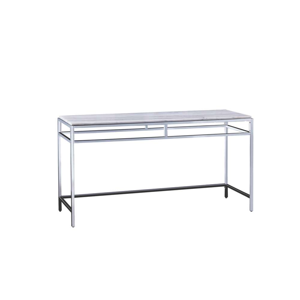 The Raiden Console Table blends contemporary design with clean, modern lines. It features a sleek chrome base paired with a smooth white marble top, creating a functional and stylish addition to any room. This table brings together durable materials and timeless design, making it a versatile piece for any space needing a contemporary touch.